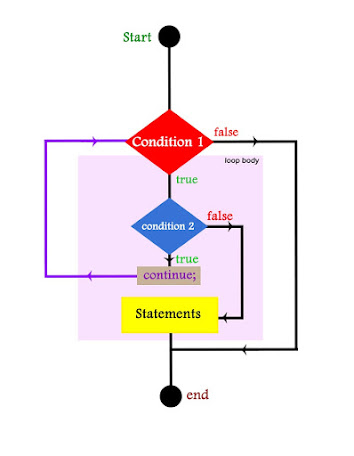 The continue statement can be used only in loops, like for loop, while and do-while. It is useful to force an early iteration of loop or continuing a loop. Whenever we use a continue in a looping structure, it skips all the statements after the continue and then moves the control to the next iteration. Most of the times, continue statement is used inside an if statement, so that it may only get executed when the specific condition approaches so as to prevent de-structuring of the code. Let's make it more clear through an example: